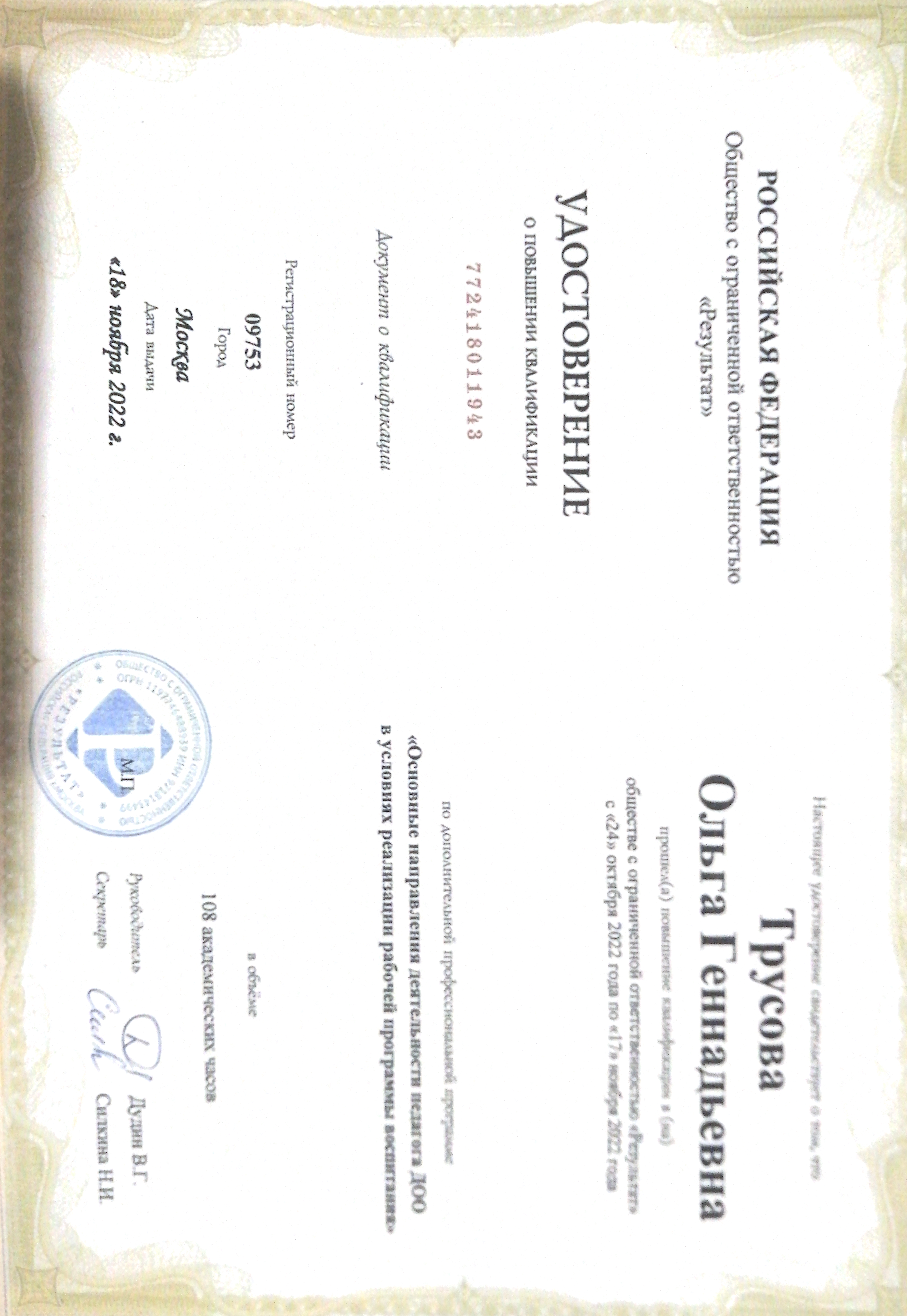 (РФ Общество с ограниченной ответственностью "Результат". 108часов.).